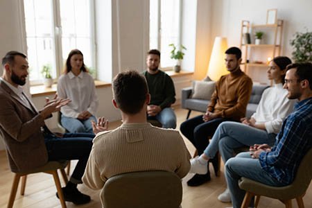 - Групповая психотерапия. На протяжении всего лечения участие профессионалов в процессе сведено к минимуму: основную поддержку члены сообщества получают друг от друга. При этом уже выздоравливающие участники поддерживают новичков и становятся примером для подражания.